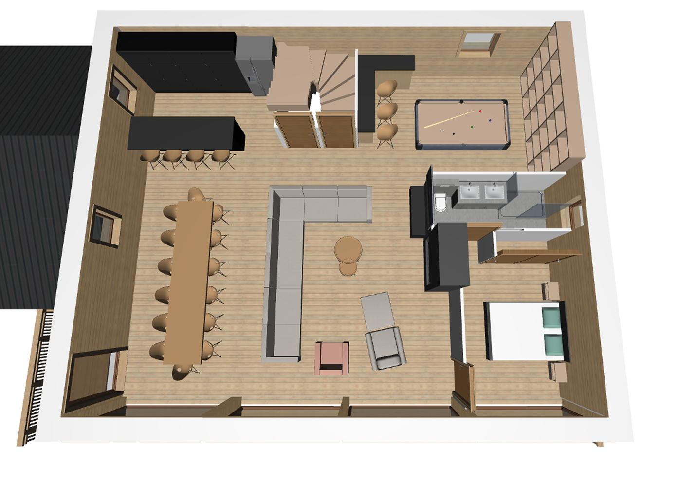 Au 2ème étage se trouve le spacieux salon et la salle à manger. Détendez-vous sur le canapé confortable avec la télévision à écran plat et profitez de l'atmosphère chaleureuse autour de la cheminée. Accès au balcon orienté au sud. La grande table de la salle à manger peut accueillir confortablement jusqu'à 16 personnes. Cuisine entièrement équipée. Deuxième espace avec un bar, une table de billard, un jeu de fléchettes et des jeux de société. Une chambre à coucher est située à cet étage.