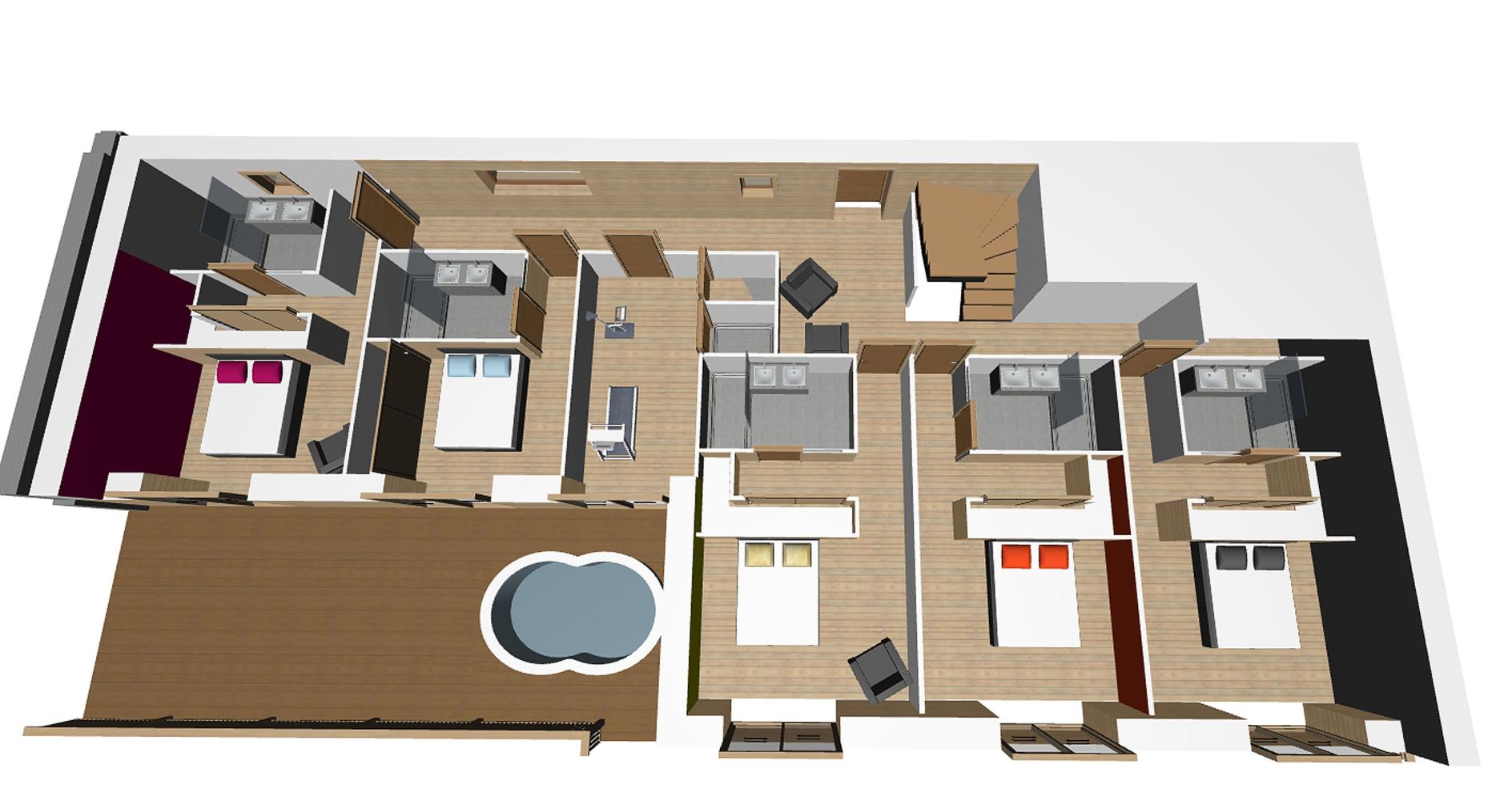 Premier étage : 5 chambres sont situées à l'étage supérieur, accès au balcon-terrasse avec jacuzzi extérieur. La salle de sport/de remise en forme dispose d'un tapis de course, d'un vélo d'appartement, d'un rameur et d'accessoires de fitness.