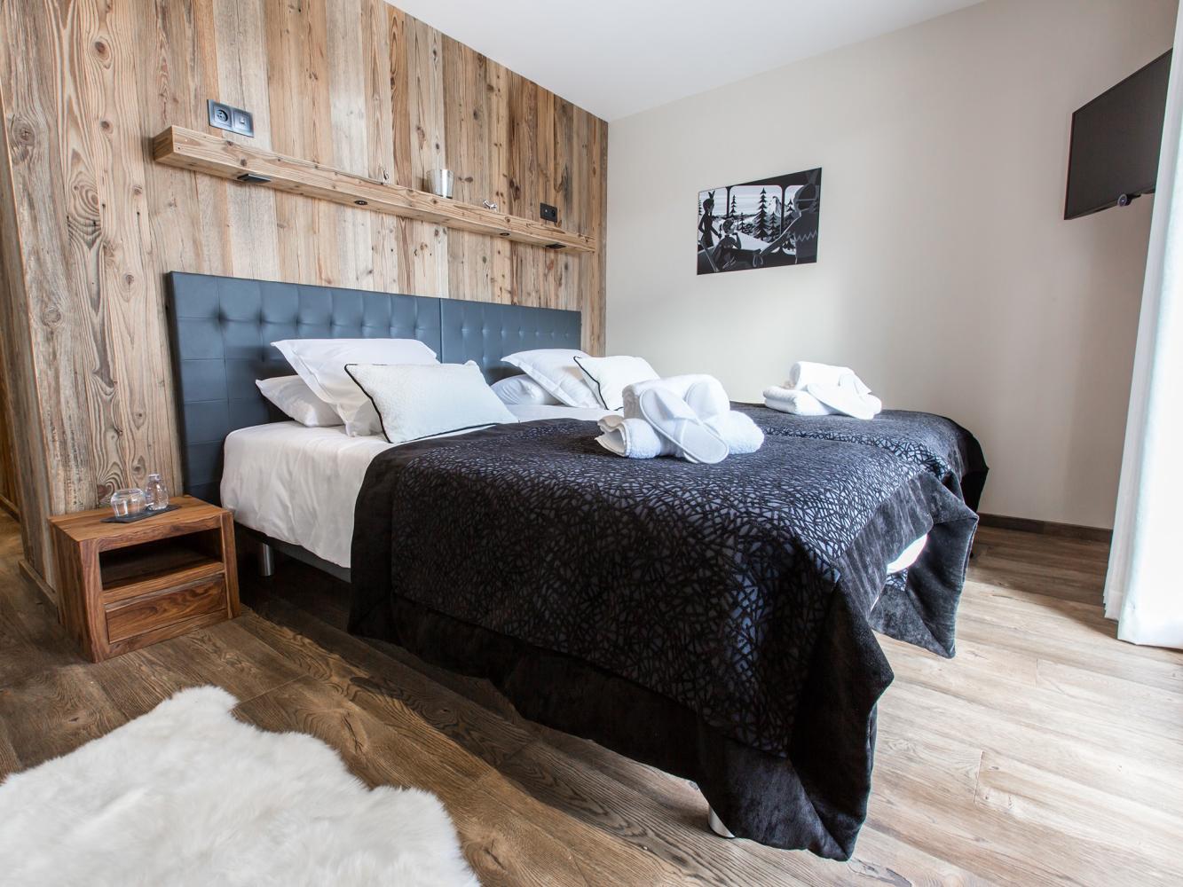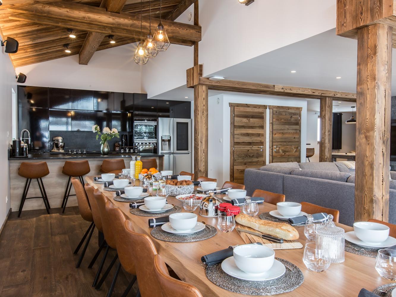 cuisine ouverte vers le séjour (lave-vaisselle + réfrigérateur avec congélateur + congélateur + cuisinière à induction + four + micro-onde + cafetière + machine à café à capsules Nespresso + grille-pain + bouilloire électrique + appareil à raclette + service à fondue + mixeur); jacuzzi extérieur; cheminée; 9 TV-satellite (écran plat); TV-satellite dans toutes les chambres; wifi gratuit; lave-linge; sèche-linge; coffre fort dans toutes les chambres; chauffage au sol; terrasse; balcon; local à ski; sèche-chaussure de ski électrique