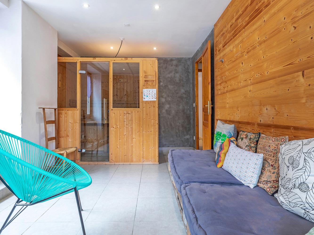 Au rez-de-chaussée se trouve le grand salon spacieux et convivial avec ses canapés et son coin cheminée ainsi que la salle à manger. Autour de la grande table, on peut dîner très confortablement avec 10 personnes. Nouvelle cuisine américaine moderne et bien équipée. Également sur ce niveau, il y a l'espace détente avec sauna, chaises longues et douche. En plus, une chambre à deux lits simples (90 x 200 cm) avec sa salle de bain en suite et WC séparé.